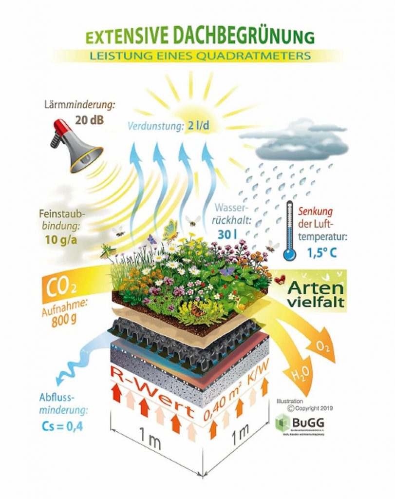 Ein einfaches Gründach kann bereits die Hälfte des Regenwassers, dass auf das Dach fällt speichern. Das durch die Dauerbestrahlung der Sonne ausgesetzes Gründach nutzt das Wasser für seine Pflanzen und gibt das übrige Wasser in den Tagen nach dem Starkregen durch Verdunstung wieder frei.